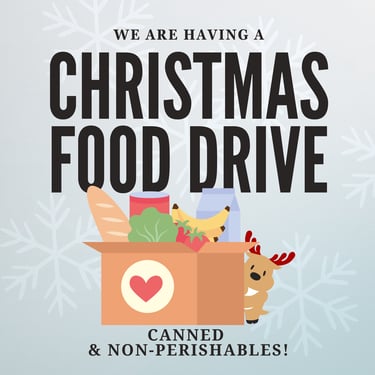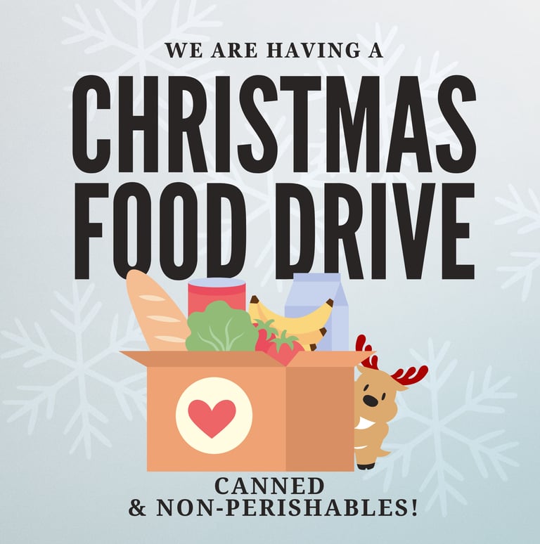 This Christmas, we're coming together to make a difference in our community. We're partnering with our local food bank to collect non-perishable food donations — everything from canned goods, cereals, and pasta to rice, soup, boxed meals, and granola bars. Every contribution, big or small, makes an impact.